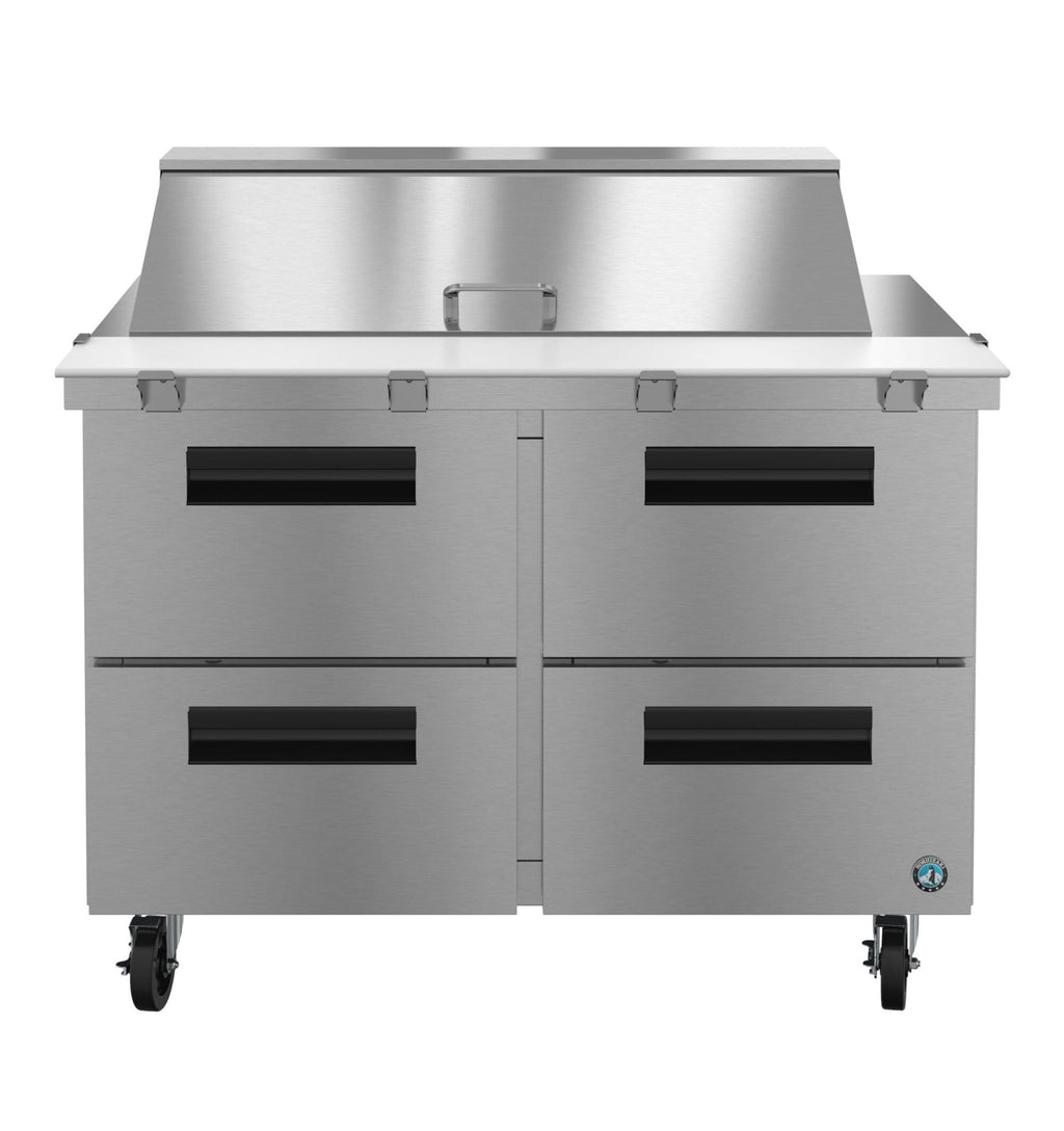 The Hoshizaki SR48B-18MD4 Steelheart Series Mega Top Refrigerator is a durable, high-performance prep solution designed for fast-paced commercial kitchens. With four refrigerated drawers and a 48" width, this two-section reach-in prep table provides efficient ingredient access and reliable cooling—ideal for sandwich shops, salad prep, pizza stations, and multi-item menu operations.